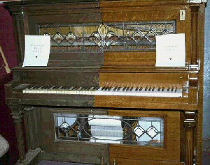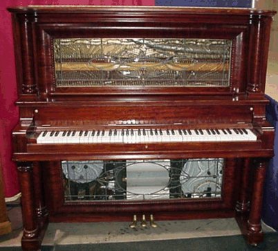 Justification: How does one justify spending $10,000 for a nickelodeon? Easy. The instruments, stained glass, beautiful stylish Victorian cabinet and unmatched sound of a full fledged Orchestral player piano. Also, the constant playing "O" roll eliminates the need to physically stand over the piano to change the roll every 3 minutes. Many people visualize listening to the player at a party while entertaining guests only to find that their backs are to the crowd when they are pumping the player. This can be disheartening. There are many advantages to a Ragtime Nickelodeon, such as quick changing rolls, coin operation, lighted stained glass, and an Antique investment! |