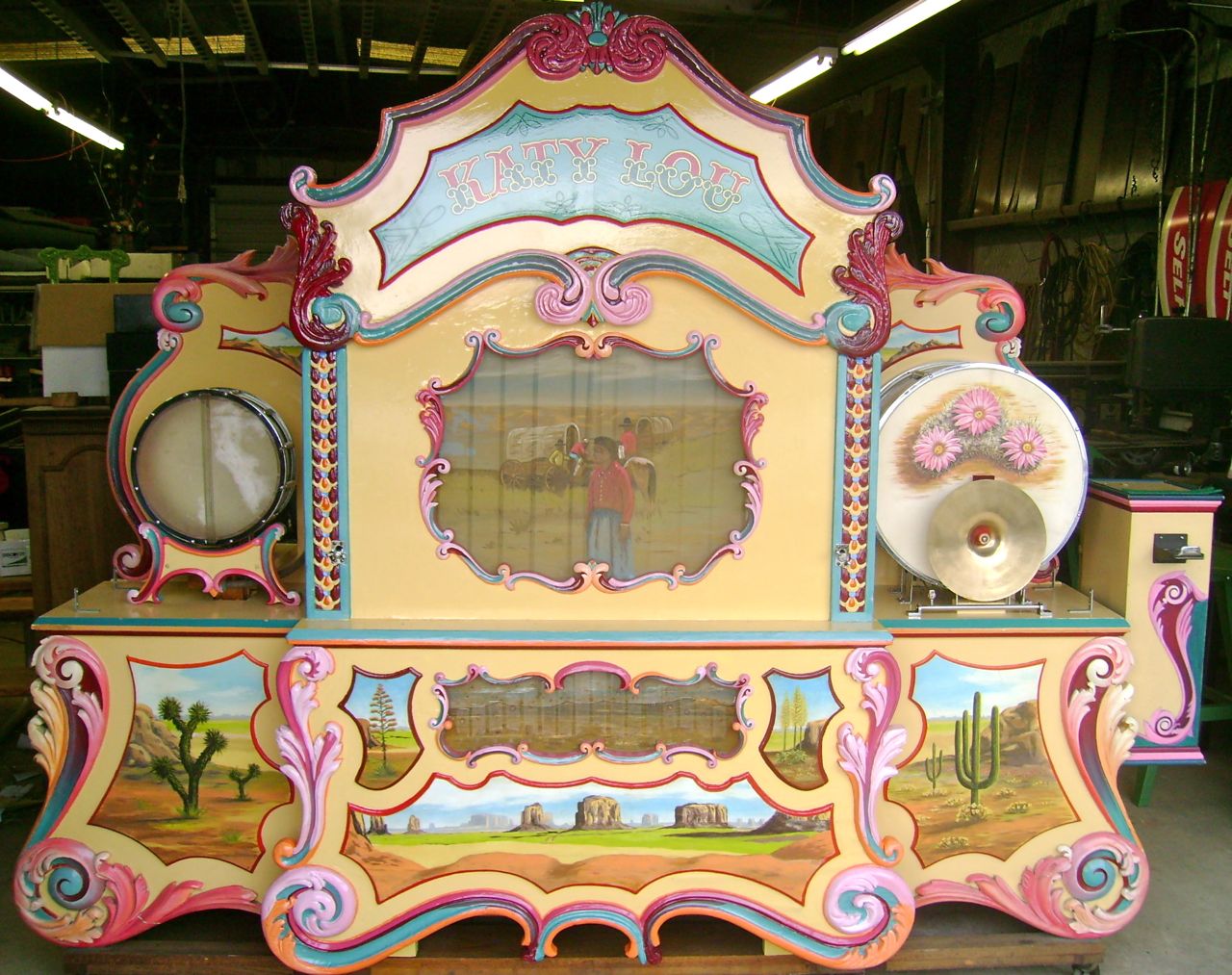 Katy Lou is owned by the Emporium on the Strand in Galveston, Texas. It is a delightful Wurlitzer Style #153 Duplex Organ made by Wurlitzer Company of North Tonawanda, New York in 1917. Music is controlled by perforated music rolls. Katie Lou has two roll mechanisms capable of playing 20 selections before repeating them hence the name duplex organ. Listening to this unique instrument is a treat. There is no sound like a Wurlitzer Band Organ to brighten your day.